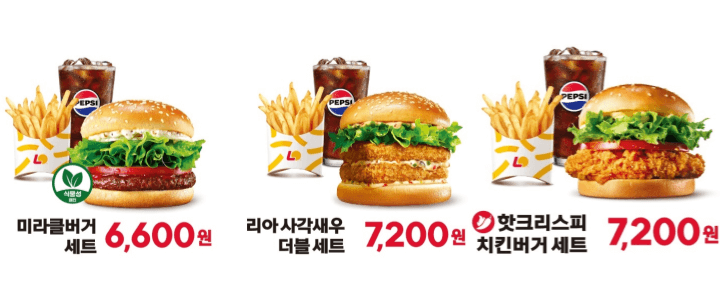 | 🍔 리아 사각새우더블 세트 | 사각새우더블버거 + 감자튀김 + 콜라 | 7,200원 |