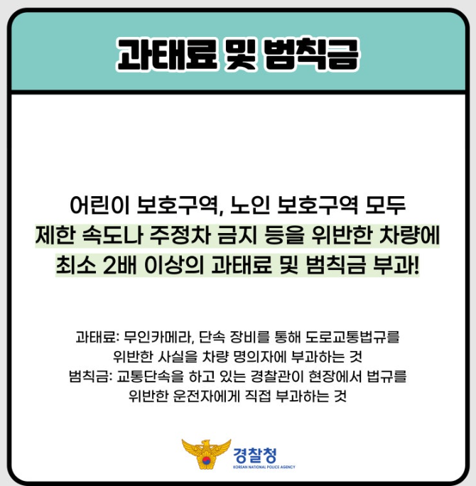 차량 | 일반 도로 과태료 | 스쿨존 과태료 | 기본 벌점 | 스쿨존 가중 벌점 |
