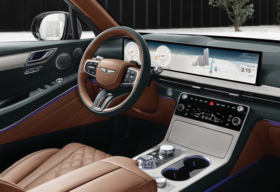 GV80 하이브리드의 실내는 제네시스가 추구하는 "여백의 미"를 그대로 계승하면서도, 하이브리드 전용 인터페이스와 디지털 요소들이 강화되었습니다. 대시보드는 27인치 통합 와이드 디스플레이로 구성되어 운전석부터 중앙까지 매끄럽게 이어지며, 전자식 변속 다이얼과 터치 인터페이스가 조화를 이룹니다.