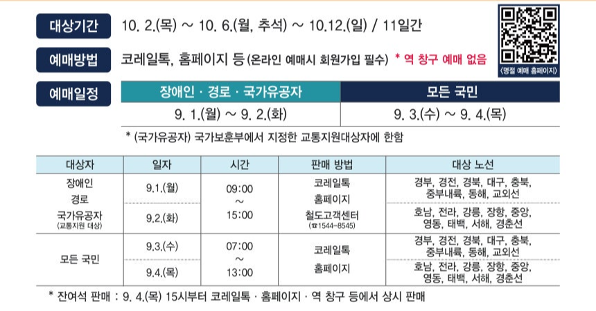 - 예매 방법: 코레일 명절 예매 전용 페이지 또는 고객센터(1544-8545)