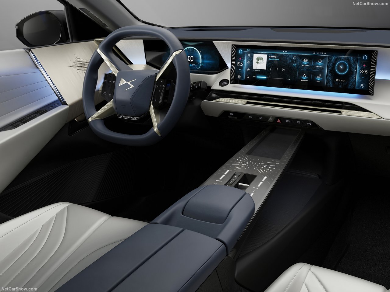 DS No8의 실내는 아방가르드 디자인과 수공예 디테일이 어우러진 공간입니다. 대시보드와 도어 트림에는 고급 가죽과 알칸타라, 원목 소재가 수작업으로 적용되었으며, 물리 버튼 대신 유리 터치패드 방식의 인터페이스가 주요 기능을 조작하게 구성돼 있습니다.