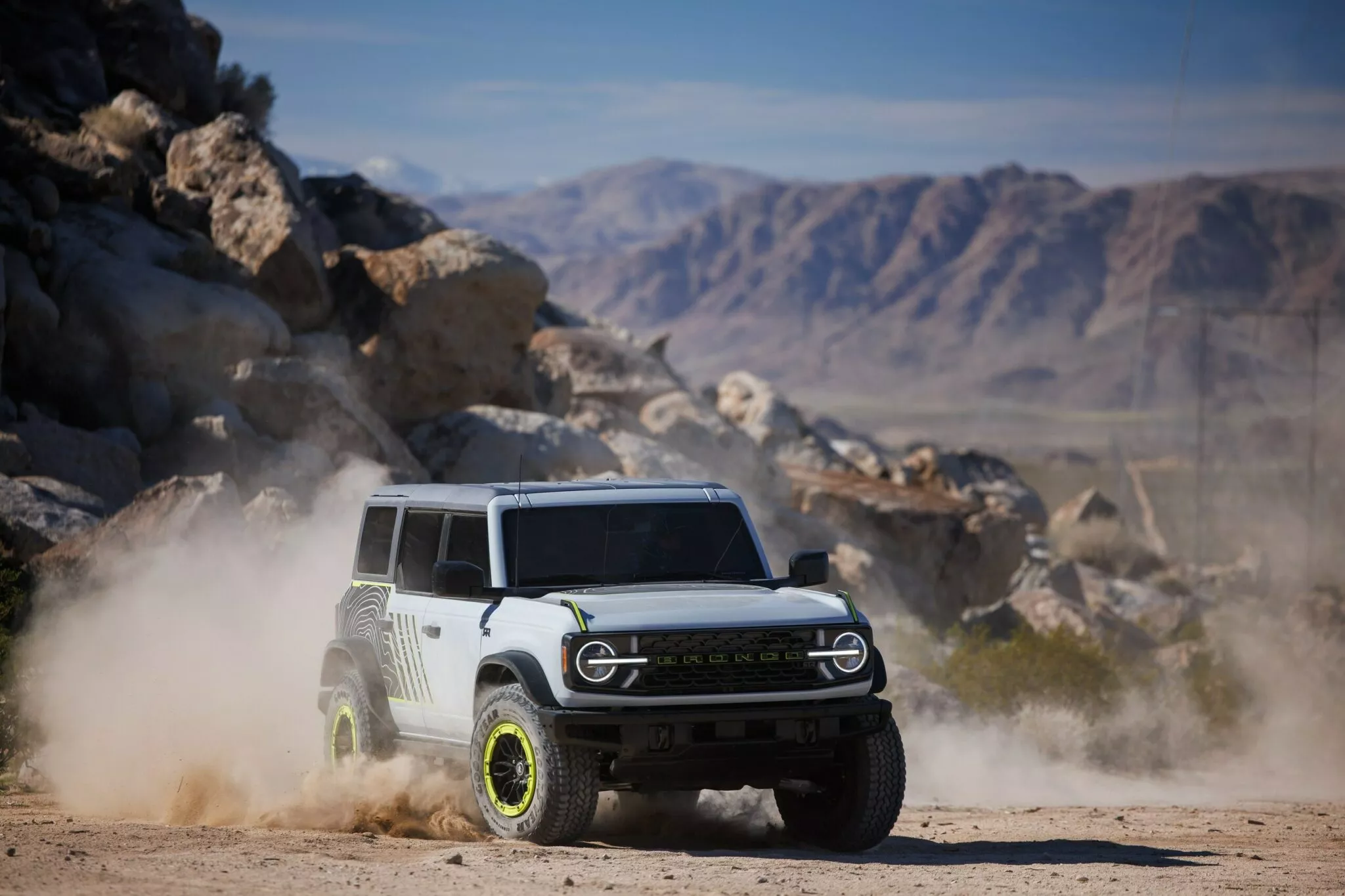 브롱코 RTR는 멀리서 봐도 그냥 브롱코처럼 보이지 않습니다. 전용 휠 디자인에 하이퍼 라임 포인트가 곳곳에 들어가고, 측면 그래픽과 넓어진 휠 아치가 눈에 띕니다. 전면 범퍼는 블랙으로 처리돼서 한층 공격적인 인상을 줍니다.