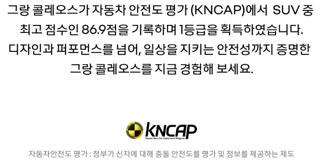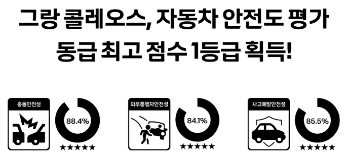 이로써 그랑콜레오스는 단순한 패밀리 SUV가 아닌, 운전자와 탑승자의 생명과 직결되는 핵심 안전 기준을 충족한 모델로 입증됐습니다.