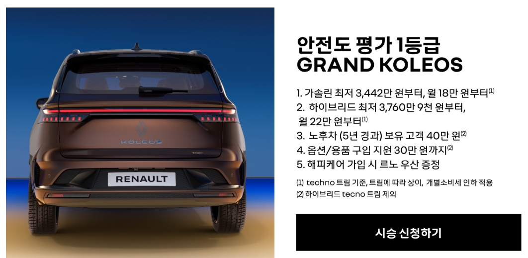 르노코리아는 그랑콜레오스의 KNCAP 1등급 획득을 기념해 다음과 같은 전국 단위 한정 프로모션을 실시합니다.