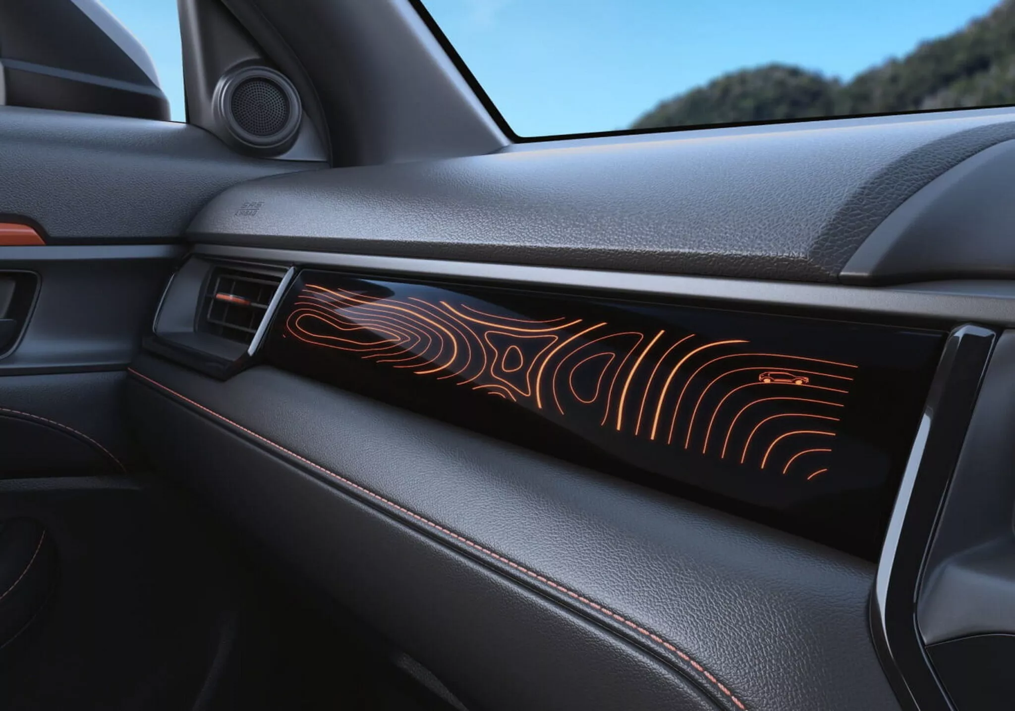 실내에서는 인조가죽 인테리어와 오렌지 포인트가 그대로 이어집니다. 블랙 헤드라이너와 액티브 오렌지 스티치가 들어간 시트가 적용되어, 고급스럽지만 활기찬 분위기를 연출해요.