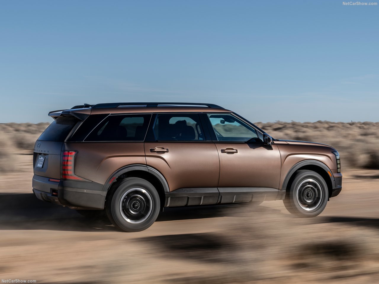 팰리세이드 XRT Pro는 전용 전면부 범퍼와 블랙 아웃 그릴, 입체감 있는 범퍼 하단 가드 등으로 무장하여 일반 모델과는 다른 인상을 줍니다. 루프랙은 기존보다 하중을 더 견딜 수 있도록 설계되었으며, XRT Pro 전용 18인치 다크 피니시 알로이 휠과 올터레인 타이어가 적용되어 험로 주행 성능도 고려되었습니다. 또한, 전용 컬러인 '어스 브라스 매트'가 추가되어 강인한 인상을 극대화합니다.