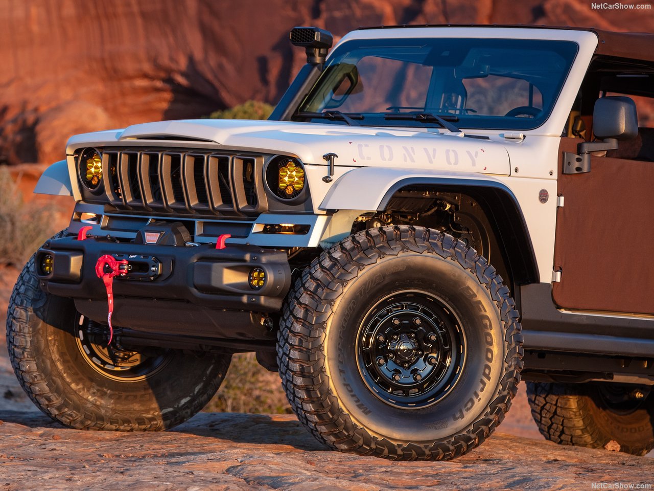 콘보이 콘셉트는 2025년형 지프 글래디에이터 모하비(Gladiator Mojave)를 기반으로 제작된 쇼카(Show Car)로, 과거 J-트럭 시리즈에 대한 오마주 성격을 지닌 밀리터리 스타일 트럭입니다. 이름에서 유추할 수 있듯이 ‘Convoy(호송 차량)’라는 테마에 걸맞은 전술적 외관을 갖췄으며, 탐험과 원정, 극한 오프로딩에 초점을 맞춘 차량입니다.