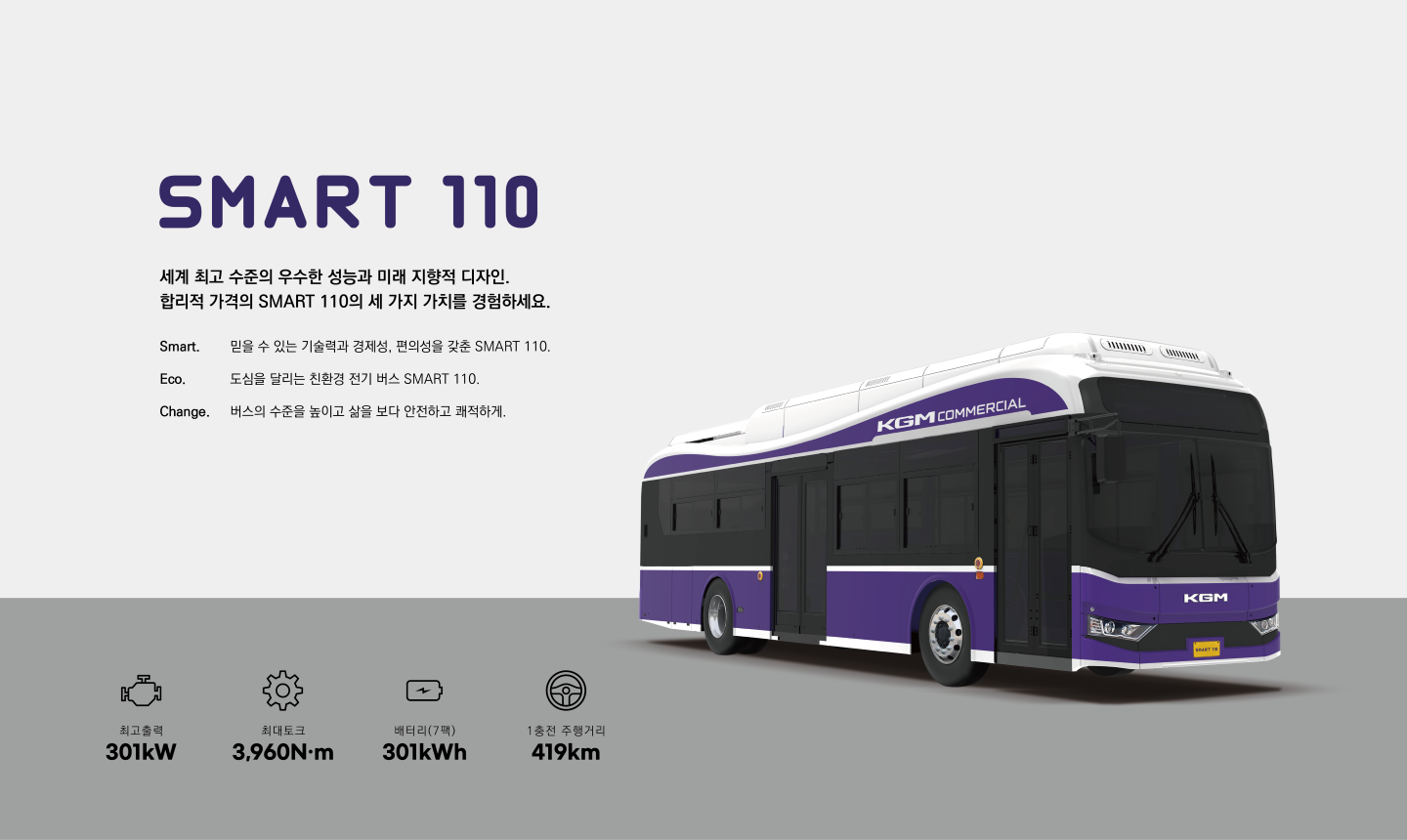 - KGM 스마트 110 (EV): 전기 구동 시스템을 탑재한 친환경 버스