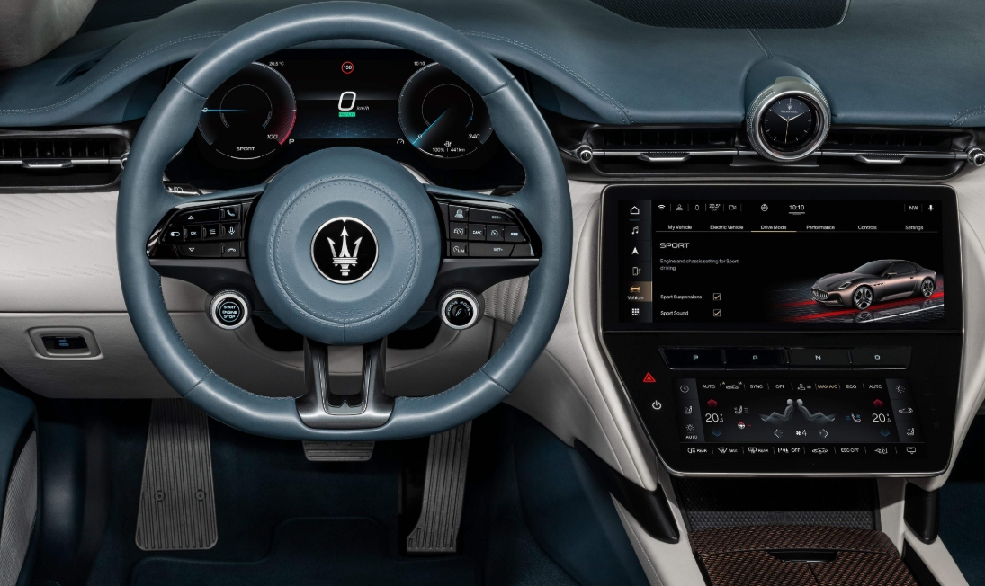 - 곡선형 보닛과 길게 뻗은 프론트는 역동성을 강조하며, 전면부에는 마세라티 특유의 스페이스 글릴(Trident grille) 디자인이 EV 버전 전용으로 다듬어져 존재감을 드러냅니다.