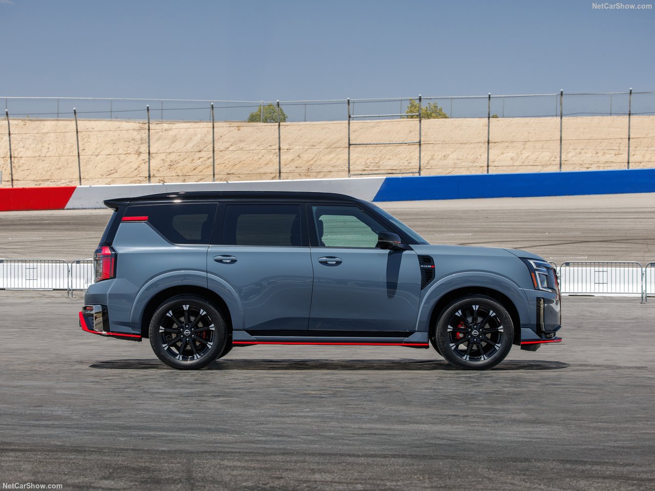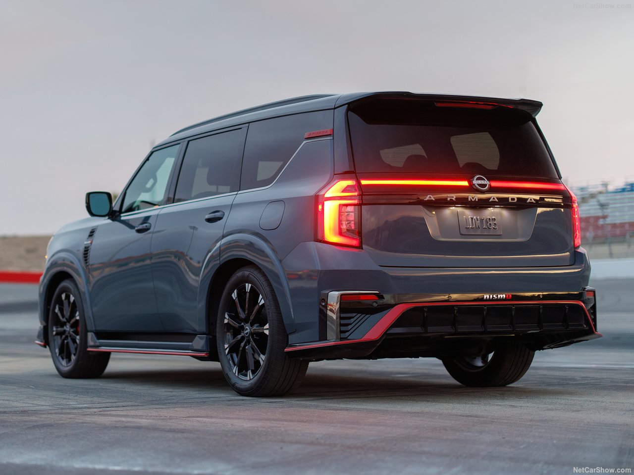 아르마다 니스모는 기본형 아르마다보다 훨씬 공격적인 외관 디자인을 자랑합니다. 프론트 범퍼는 대형 에어 인테이크와 블랙 하이글로시 소재로 스포티함을 강조하며, 그릴에는 레드 액센트가 삽입되어 니스모 특유의 정체성을 드러냅니다. 사이드에는 전용 22인치 니스모 전용 단조 알로이 휠과 레드 브레이크 캘리퍼가 장착되고, 후면부에는 블랙 루프 스포일러 및 전용 배기 팁이 더해져 역동적인 SUV의 이미지를 완성합니다.